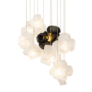 100.11 is a low-voltage arrangement of 11 blown glass pendants, each housing a 1.5-watt LED lamp.