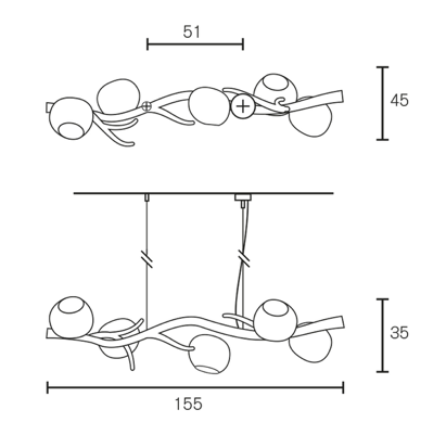 ERSAV110N-GLIRI, Ā length 155cm, height 35cm, 5 x E27, nickel finish, glass sphere clear